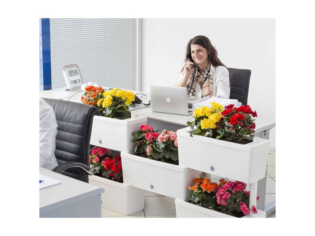 Truhlíky obsahují vnější a vnitřní nádoby, které se snadno zasouvají. Automatický zavlažovací systém zajišťuje optimální vlhkost pro rostliny. Množství vody lze jednoduše kontrolovat pomocí měrky hladiny vody.