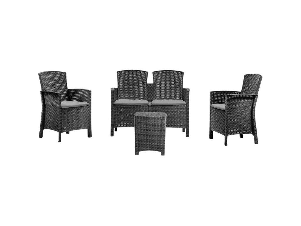 Souprava je vyrobena z lisovaného plastu v imitaci ratanu v barvě antracit. Materiál je odolný vůči UV záření a změnám teplot, snadno se udržuje a má dlouhou životnost. Nábytek je robustní, stabilní a může být ponechán venku po celý rok.